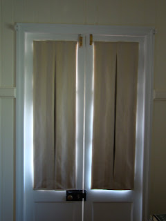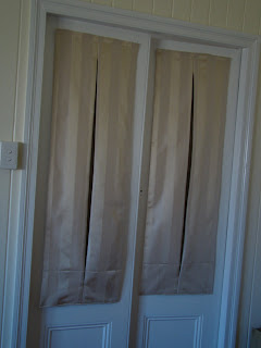 I also made some simple box pleat curtains for the small windows on the double doors that lead to our balcony and our ensuite (our ensuite doors have clear glass – not fantastic for the person trying to sleep when the other has to do a middle-of-the-night bathroom trip!), which I attached to the doors with the same velcro as the blinds: