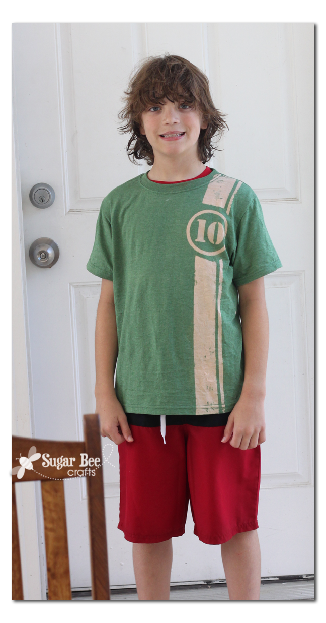 My son is actually away with his grandparents right now, so I grabbed my cousin for a quick model in case you wanted to see the shirt actually on a boy:
