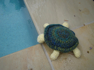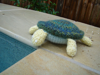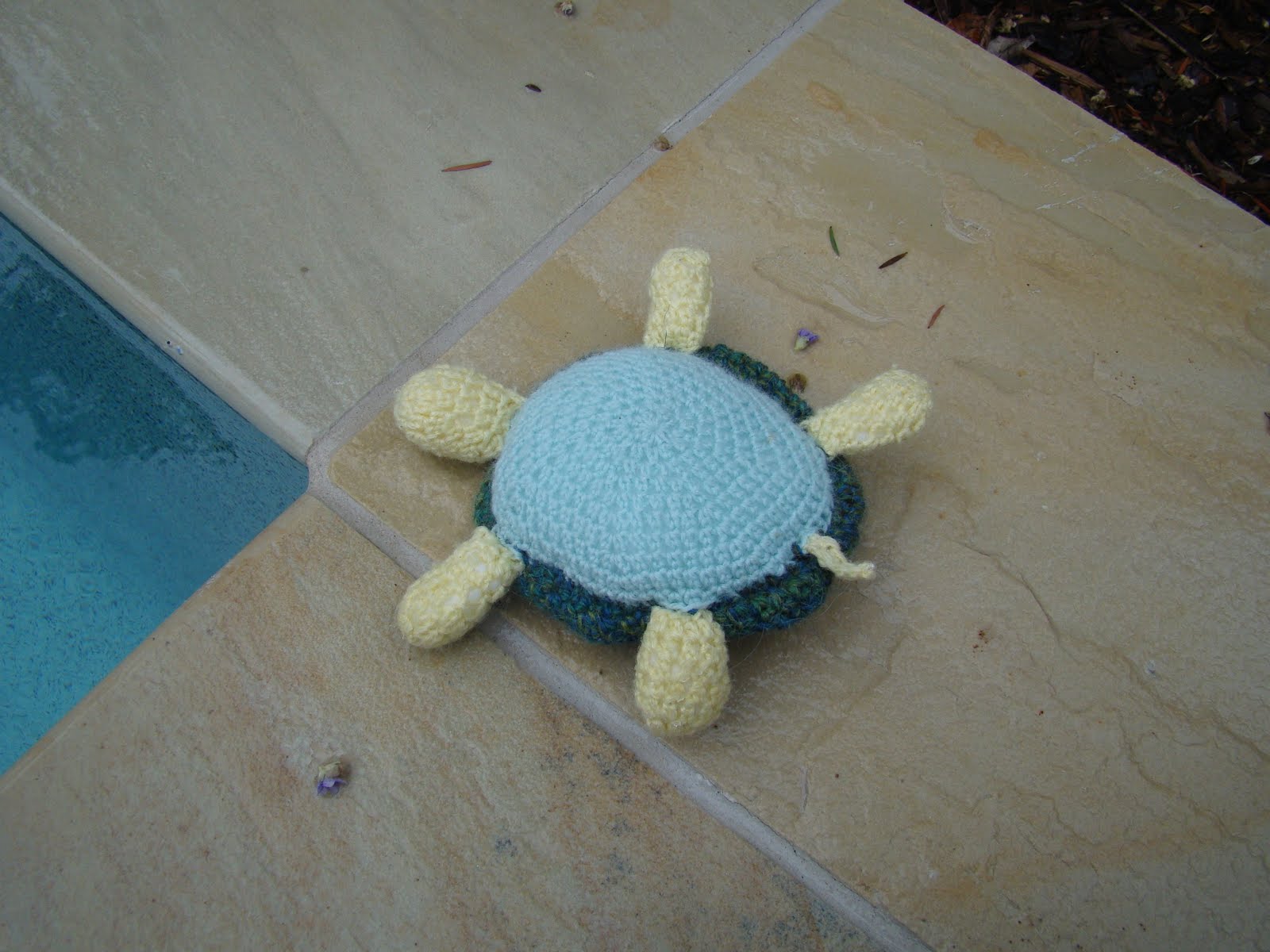 I found a great multi-coloured wool for the turtle shell – Patons Jet in Colour 9, and then used up scraps of wool for the undershell, legs, head and eyes. Here’s the end result:
