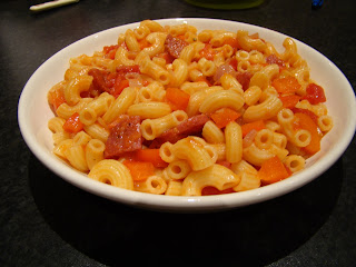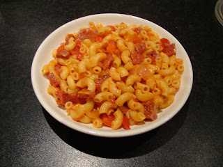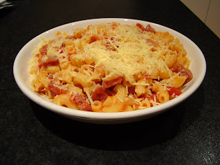 Tuesday nights are Pasta Nights in our house (well, actually, the menu plan theme is “meals that taste good re-heated” as my husband works late on Tuesday nights. I feel bad when he gets home tired if I feed him meat and veg that doesn’t re-heat well). I’m running down meat stocks in my freezer, so I don’t have any mince, and I’ve had my pesto pasta a few too many times lately (I didn’t think ti was possible), so I rummaged around in the pantry, and threw together this pasta.
