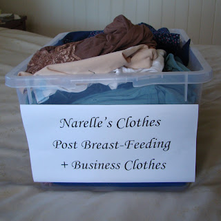The reason I included the breast-feeding categories was so I don’t have to hunt for clothes during the newborn haze. I then put all the tops in category 1 into the box that formerly held my maternity clothes – if I won’t be able to wear them in more than a year, I don’t want to see them. All the other tops got put into the drawer, in neat sections. I shoved at the back of the drawer the clothes in a couple of the categories that I don’t really like, but still want to keep for those days when I’m not leaving the house and am a bit behind in the laundry. I also packed away the business shirts in my wardrobe, since I won’t be heading back to work anytime soon. I did keep out a couple of shirts, just in case something crops up and I have to attend an interview.